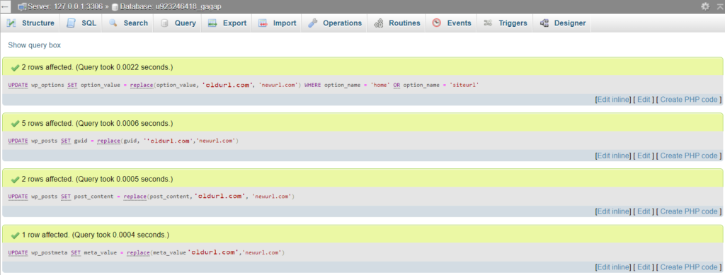 UPDATE wp_options SET option_value = replace(option_value, 'oldurl.com', 'newurl.com') WHERE option_name = 'home' OR option_name = 'siteurl';UPDATE wp_posts SET guid = replace(guid, 'oldurl.com','newurl.com');UPDATE wp_posts SET post_content = replace(post_content, 'oldurl.com', 'newurl.com'); UPDATE wp_postmeta SET meta_value = replace(meta_value,'oldurl.com','newurl.com');