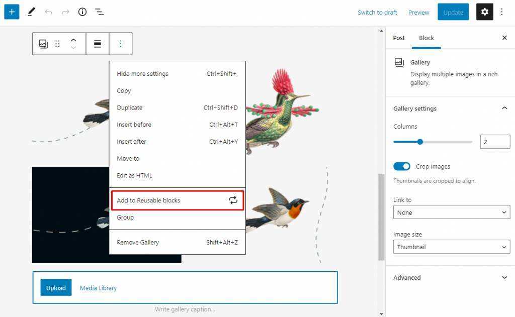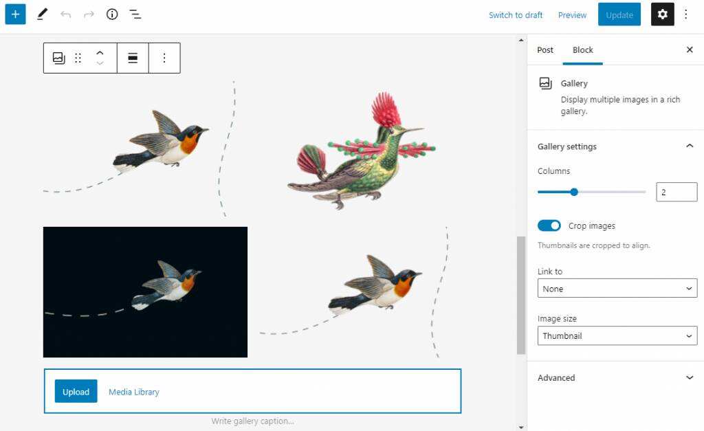 另一种处理图像的方法是使用图像库区块。这是用于添加一组图像的容器区块类型。您可以设置图库的列号以创建漂亮的网格样式显示。