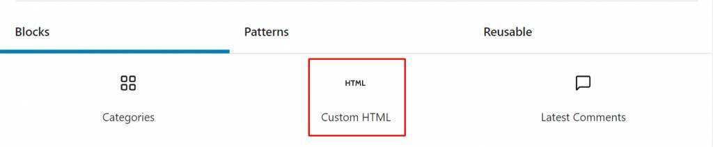 - 单击加号( + ) 图标并找到自定义HTML区块。