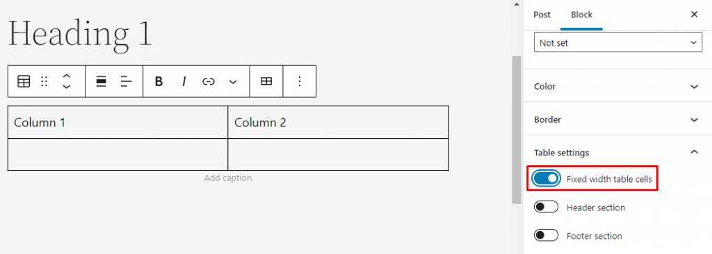 默认情况下,使用此区块创建的表格将具有响应式列宽。但是,您可以在表格设置中更改它。向下滚动区块设置面板,展开表格设置部分,然后打开固定宽度表格单元格选项。