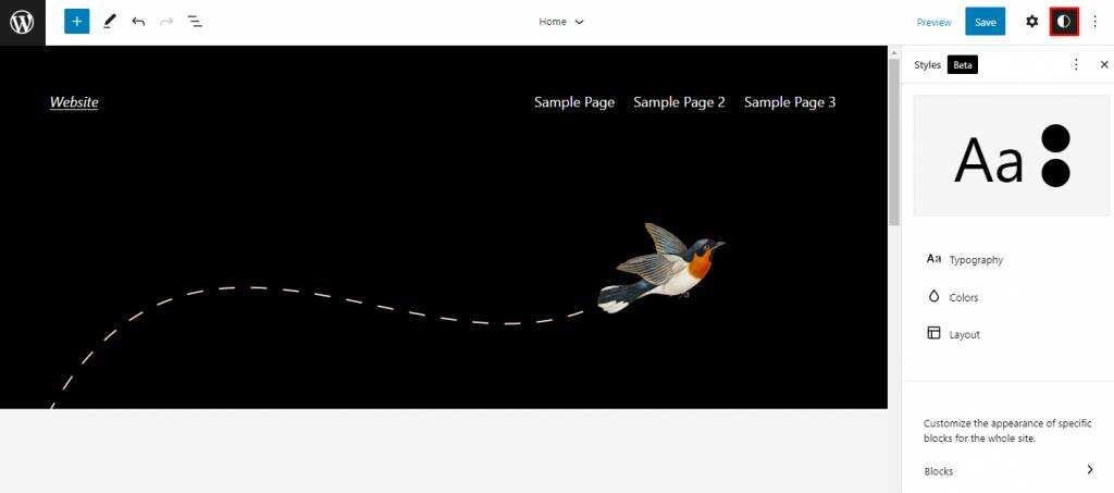 但是,该功能仅在WordPress 5.9中使用基于区块的主题时可用,包括基于区块的子主题。通过导航到外观->站点编辑器进入站点编辑器,然后单击屏幕右上角的黑白图标。全局样式界面将出现在右侧。