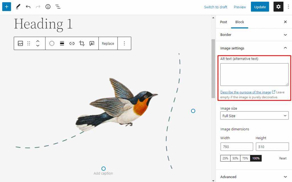 打开区块设置,您会发现图像的替代文本和图像大小选项的字段。
