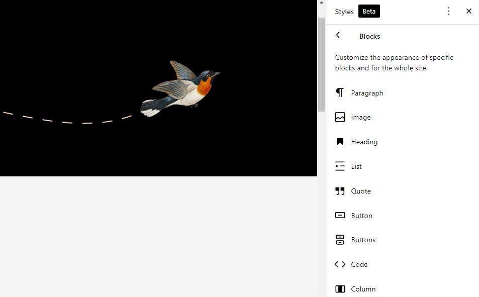 全局样式界面中的最后一项是区块选项卡,可让您自定义特定区块。选择此选项,您将看到可用区块的列表。选择其中任何一个开始定制。根据区块,您可以修改其布局、颜色、排版或所有这些。