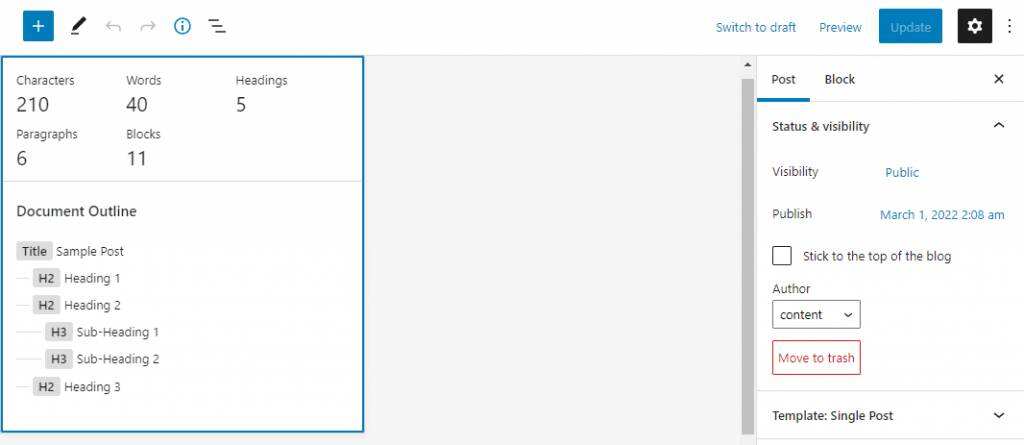 将出现的另一条信息是文档大纲。此部分仅在您使用多个标题时可用。它将显示标题结构,帮助您组织内容并改进SEO。