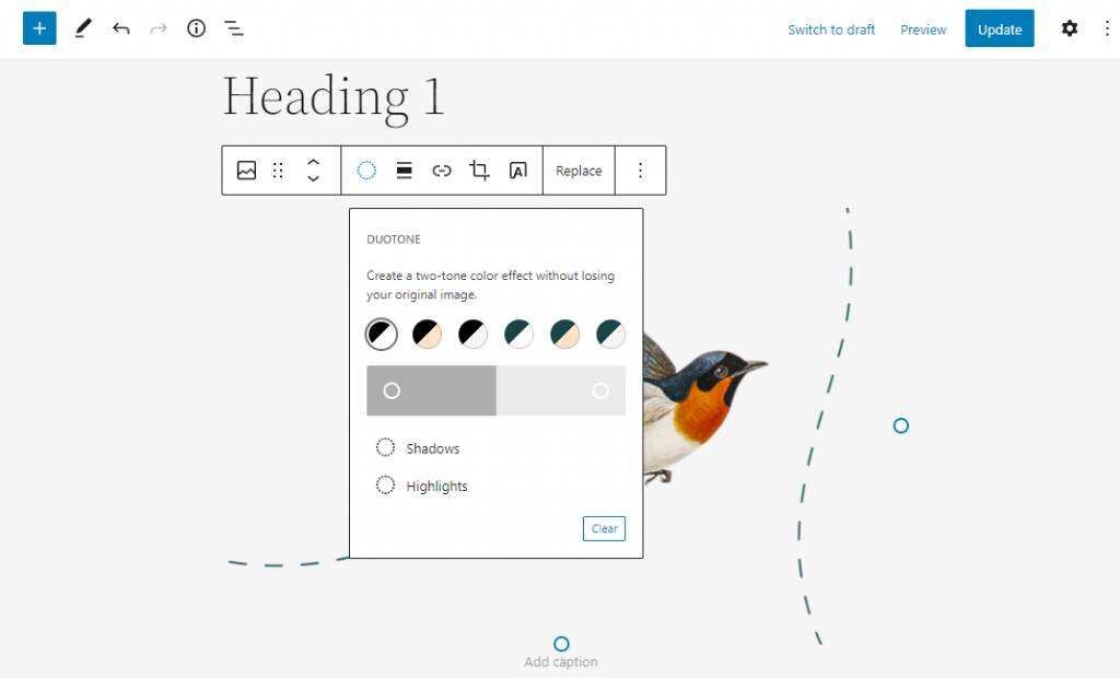 您可以在图像区块的工具栏中设置图像链接和对齐方式。还有一个双色调功能,可以使用任何可用的双色调预设来转换图像颜色。
