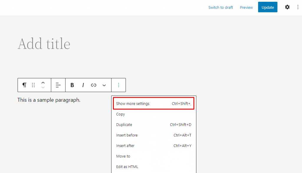 这个Gutenberg功能可以通过选项->显示活动区块中的更多设置来访问。附加设置将出现在屏幕右侧。