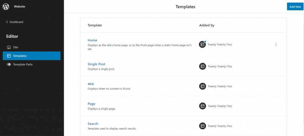 导航到Appearance -> Site Editor转到站点编辑器。通过单击屏幕左上角的WordPress徽标并选择Templates打开可折叠导航侧边栏。您应该会在右上角看到可用模板列表和添加新按钮。