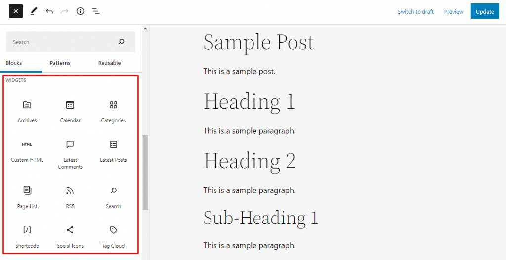 单击编辑器屏幕顶部的加号( + ) 按钮,然后选择Blocks选项卡。向下滚动到小工具部分以查找小工具的所有可用区块。