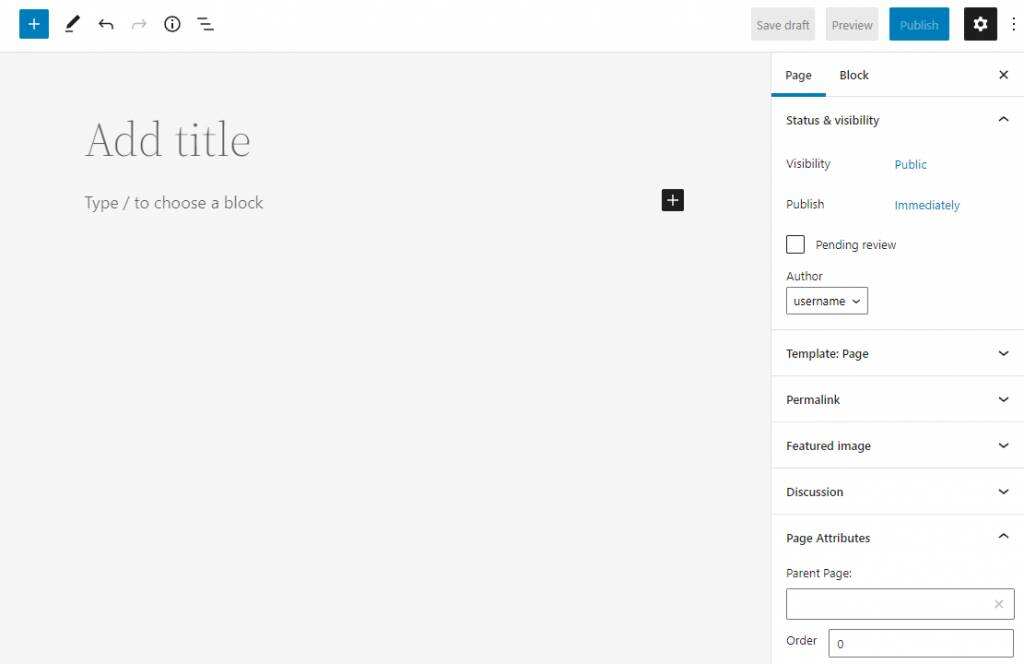 创建新页面是一个类似的过程。导航到Pages -> Add New,您将看到与创建文章的界面相同的界面。唯一的区别是右侧边栏中的页面属性设置,它指定了父页面和页面顺序。页面也没有类别或标签设置。