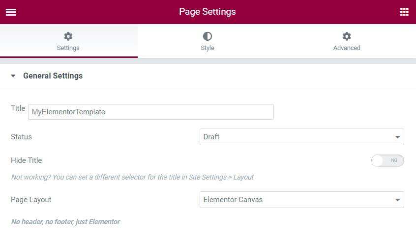 然后,您可以从提供的列表中选择您的页面布局。例如,如果您选择Elementor Canvas,您将获得一个完全空白的页面:
