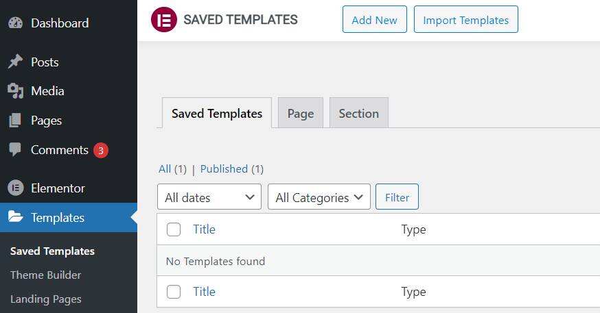 在您的网站上安装并激活Elementor后,导航到Templates并单击Add New: