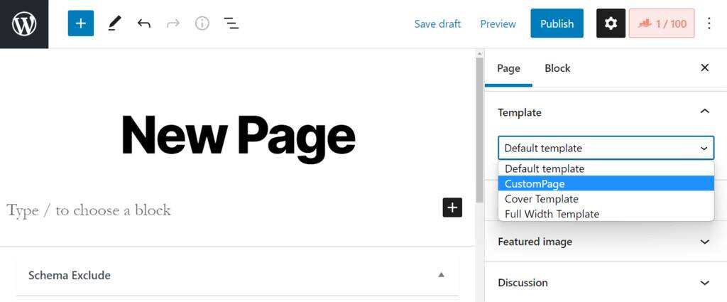 要确认这一点,请导航到您的 WordPress 管理区域并创建一个新页面(或打开一个现有页面)。在“设置”面板中,找到“模板”部分并单击它以查看您的选项: