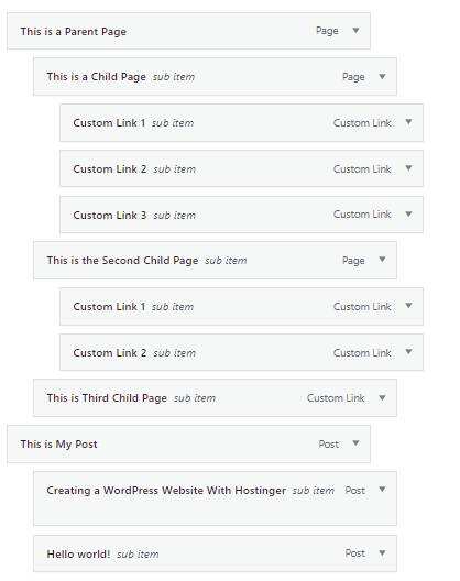 最初,菜单项将按照您添加它们的顺序出现。但是,您可以通过将它们拖放到位来轻松修改它们的组织。这将使您能够创建一个没有下拉功能的简单菜单。
