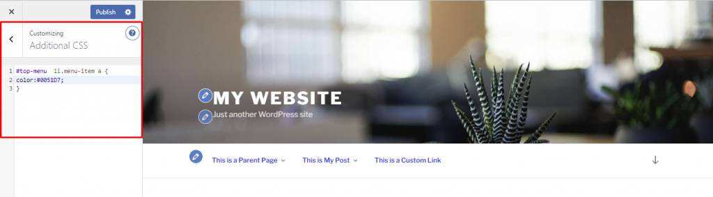 从您的WordPress仪表板盘到外观->自定义,然后使用附加CSS功能添加您自己的代码。在此示例中,我们将顶部菜单的字体颜色更改为蓝色。