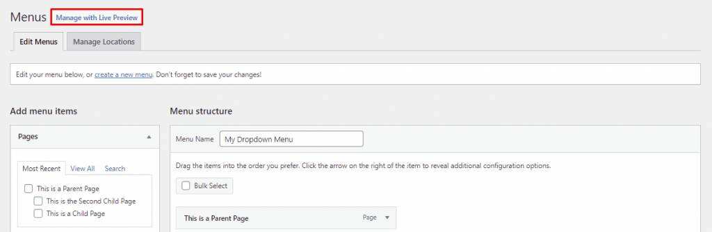 如果您在更改菜单位置时需要视觉参考,请选择页面顶部的“使用实时预览管理”按钮。实时预览模式在创建复杂的多级下拉菜单时特别有用。