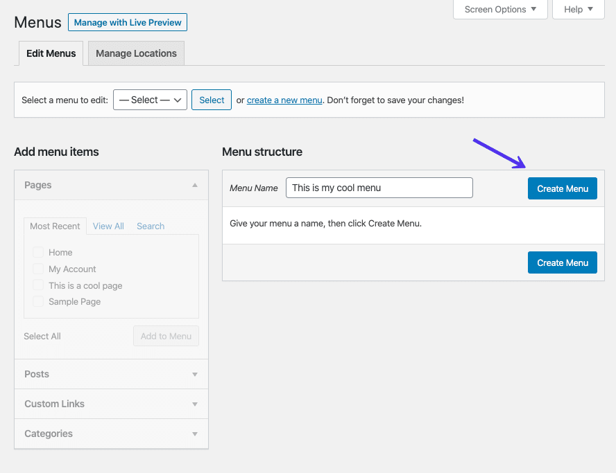 对于此示例,我们将选择后一个选项并创建一个新菜单。这包括添加标题,然后单击“创建菜单” 按钮: