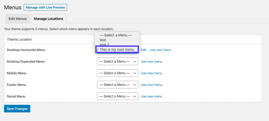 单击“使用实时预览管理” 按钮,使用WordPress定制器查看菜单在您为其选择的位置中的显示方式: