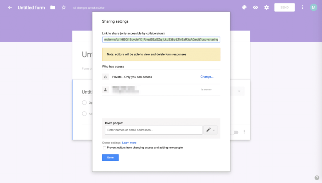 然后,您可以通过输入他们的电子邮件地址或使用链接共享功能来邀请团队成员处理您的表单。您的更改将自动保存在您的Google云端硬盘中。完成编辑后,您就可以将Goole表单嵌入WordPress网站了。