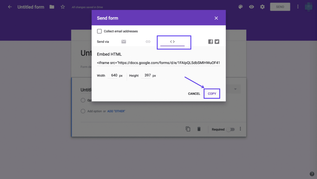 为了嵌入您的Google表单,您需要单击表单编辑器顶部的Send按钮。在那里,您将有五个共享表单的选项:通过电子邮件、链接、HTML、Facebook和Twitter:
