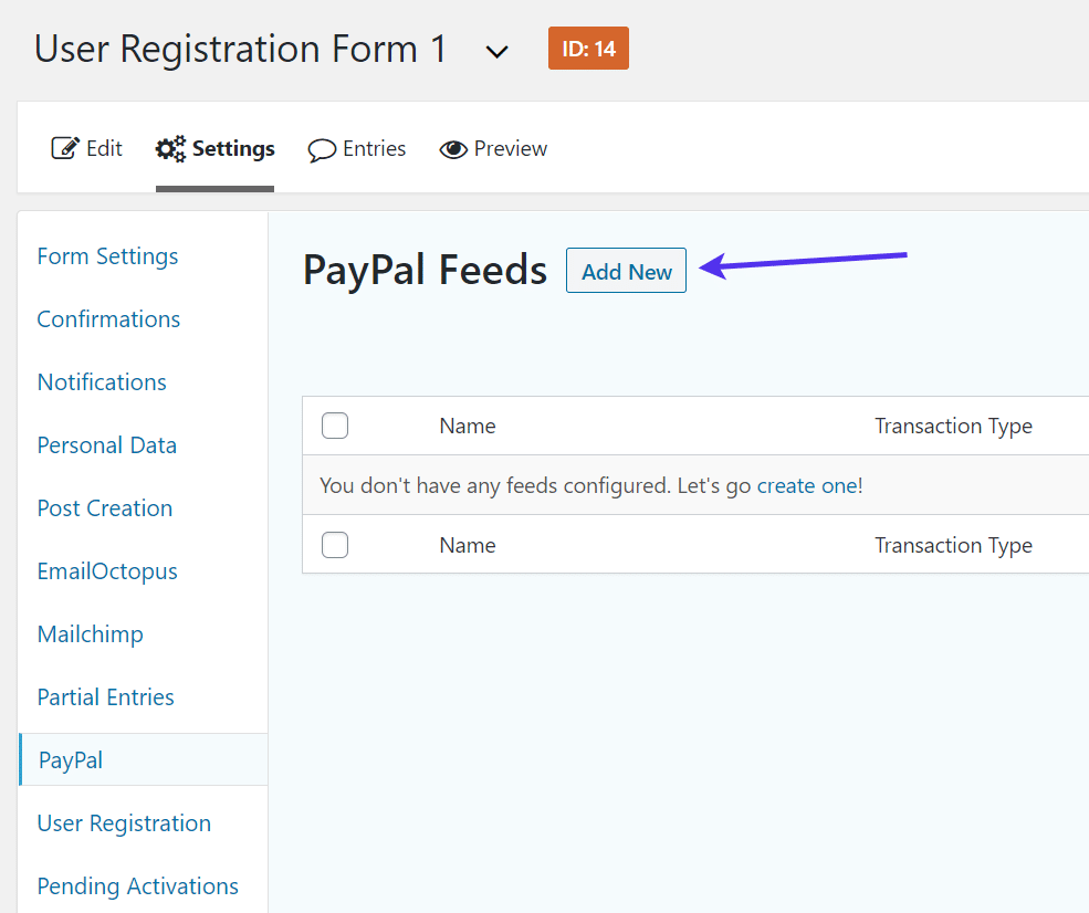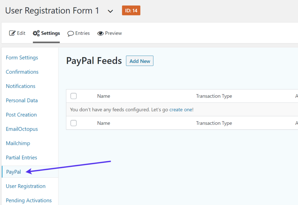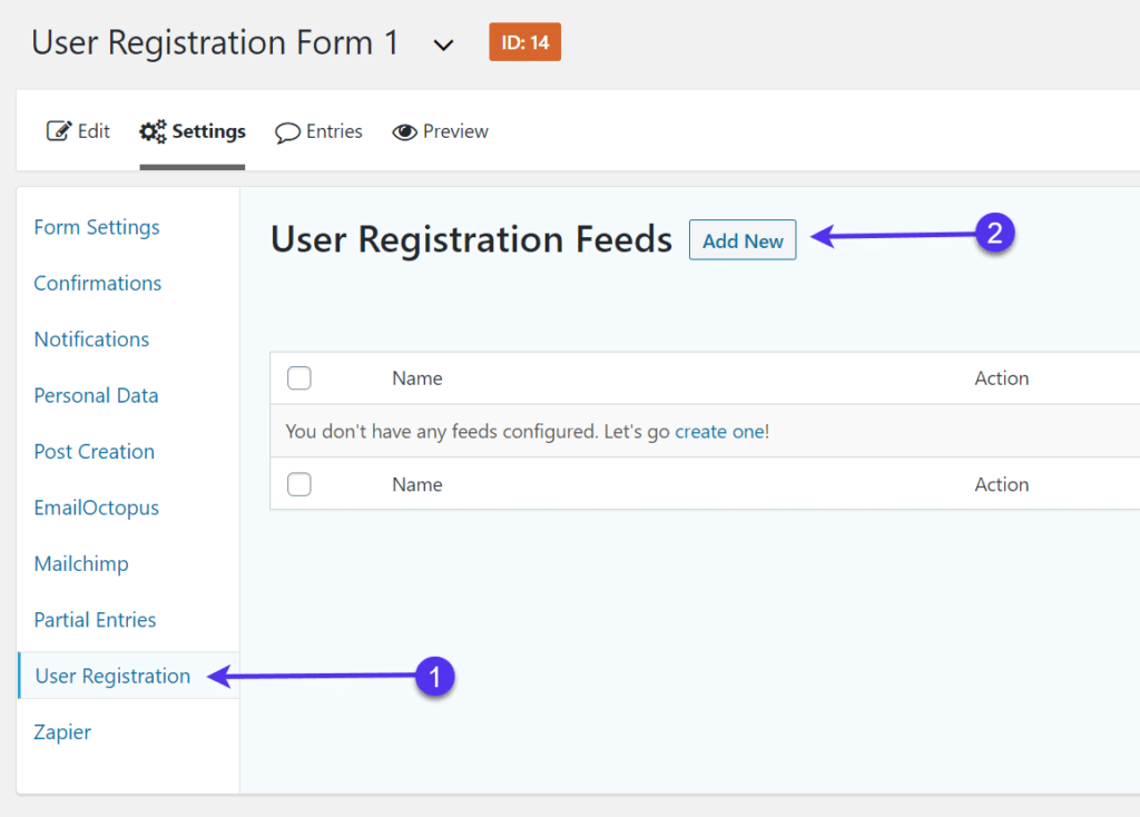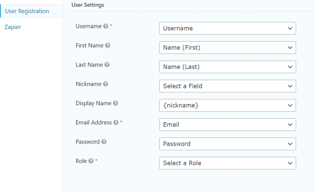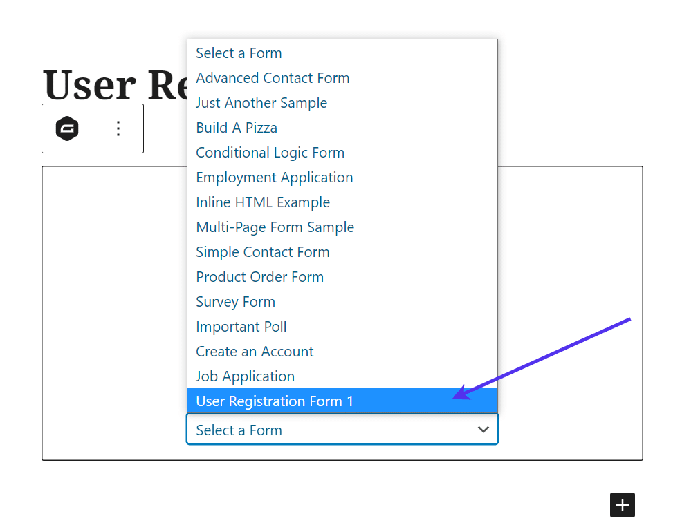 继续,单击下一个下拉字段以选择您用于用户注册的表单。我们从以前开始创建它,因此请确保您找到正确的。在本教程中,它被命名为注册表单,但您可能会使用不同的名称。