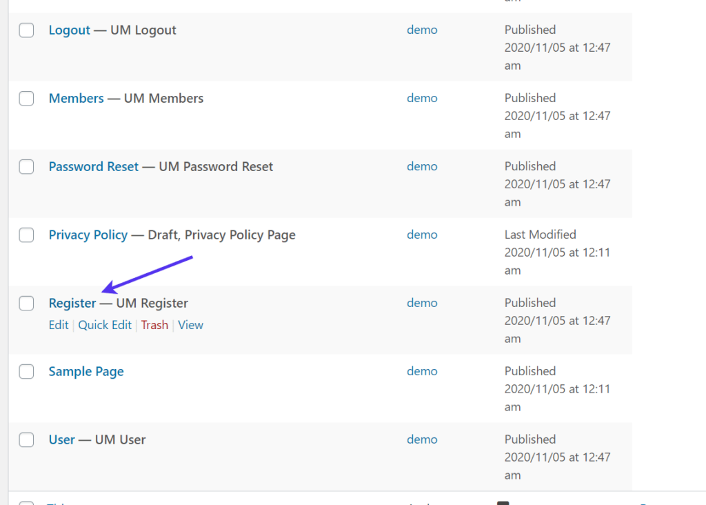转到页面 > 所有页面以查看帐户和登录页面等选项。注册页面是用户注册和登录他们的帐户的地方,而帐户页面包含默认配置文件表单,他们在其中管理他们的配置文件。