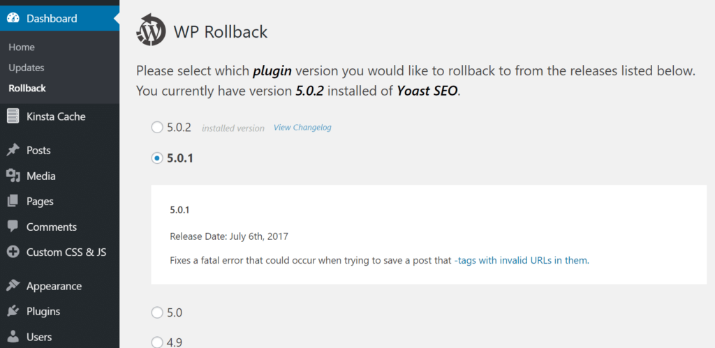 然后它将提示您输入要回滚到的版本。正如您在下面看到的,这模仿了WordPress插件库页面上“Advanced View”中可用的先前版本。从1.5版开始,您还可以查看与插件版本相关的变更日志。然后点击“Rollback”。