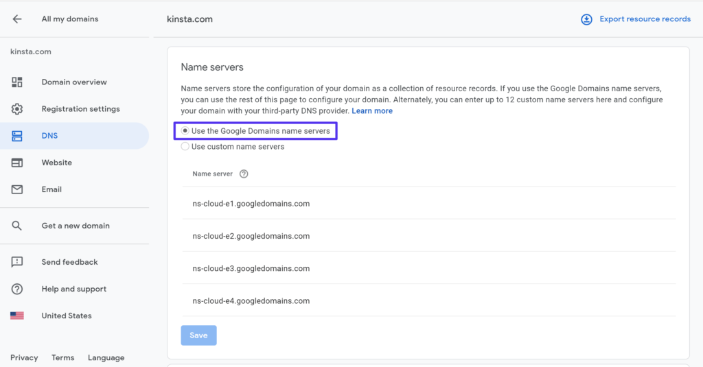 例如,下面是更改通过Google Domains注册的域中的名称服务器的样子。