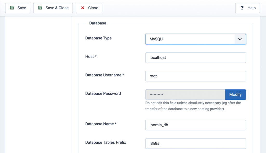 假设您通过了测试,那么您需要提供有关您的Joomla数据库的所有信息。这意味着输入您的主机名、数据库名称、用户名、密码和Joomla表前缀。