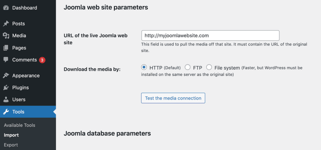 这些值对于迁移数据至关重要,因此切换到WordPress仪表盘并滚动到Joomla web site parameters部分。找到以下字段:URL of the live Joomla website。在此字段中,输入您的Joomla网站的URL并选择通过HTTP传输您的数据: