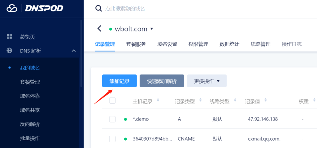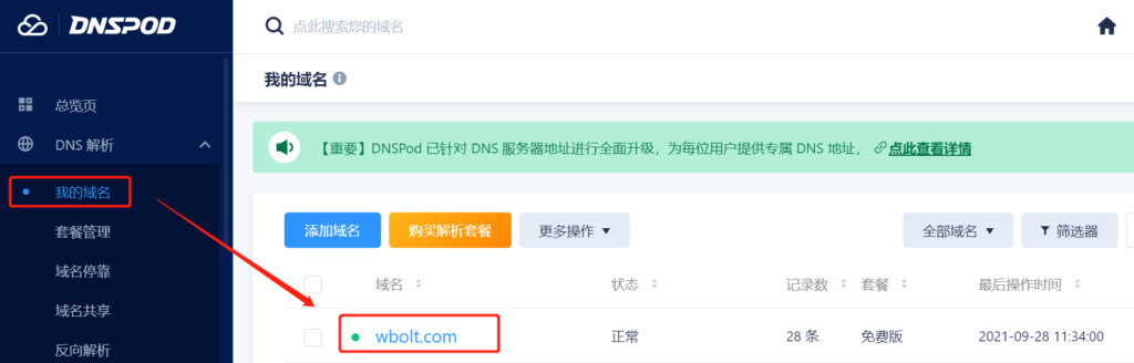 在我们的示例中,我们将向您展示如何使用DNSpod来做到这一点。无论您使用的是其他第三方DNS提供商还是您的域注册商,这都将非常相似。在DNSpod中,只需点击左侧的“DNS解析-我的域名”。然后点击您需要管理的域名。