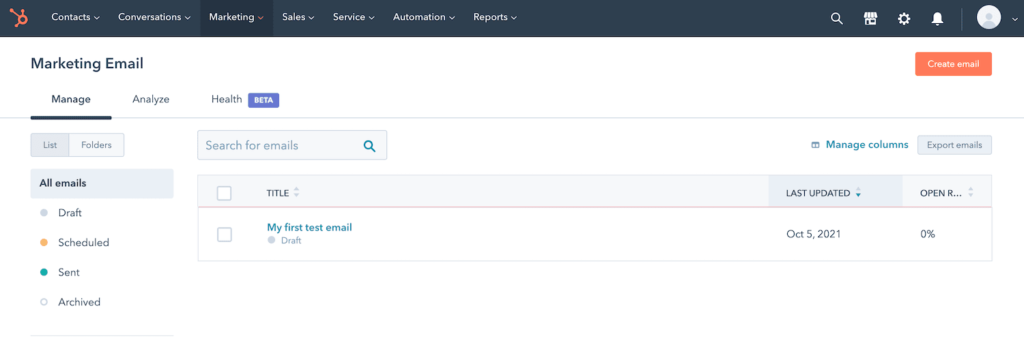 如果您是HubSpot的粉丝,您可以通过登录HubSpot仪表盘从任何电子邮件中查看性能指标。在这里,导航到Marketing > Email。
