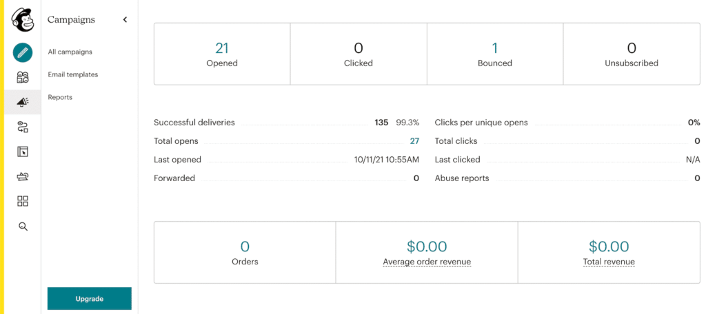 然后,请找到您要检查的电子邮件并选择其随附的View Report按钮。Mailchimp现在将显示此活动的所有信息,包括跳出率和打开率。