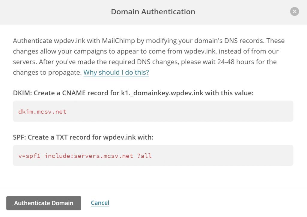 然后,MailChimp将为您提供DKIM和SPF DNS记录,您需要添加这些记录才能成功完成域身份验证。您可以通过您的DNS提供商或域注册商添加这些。