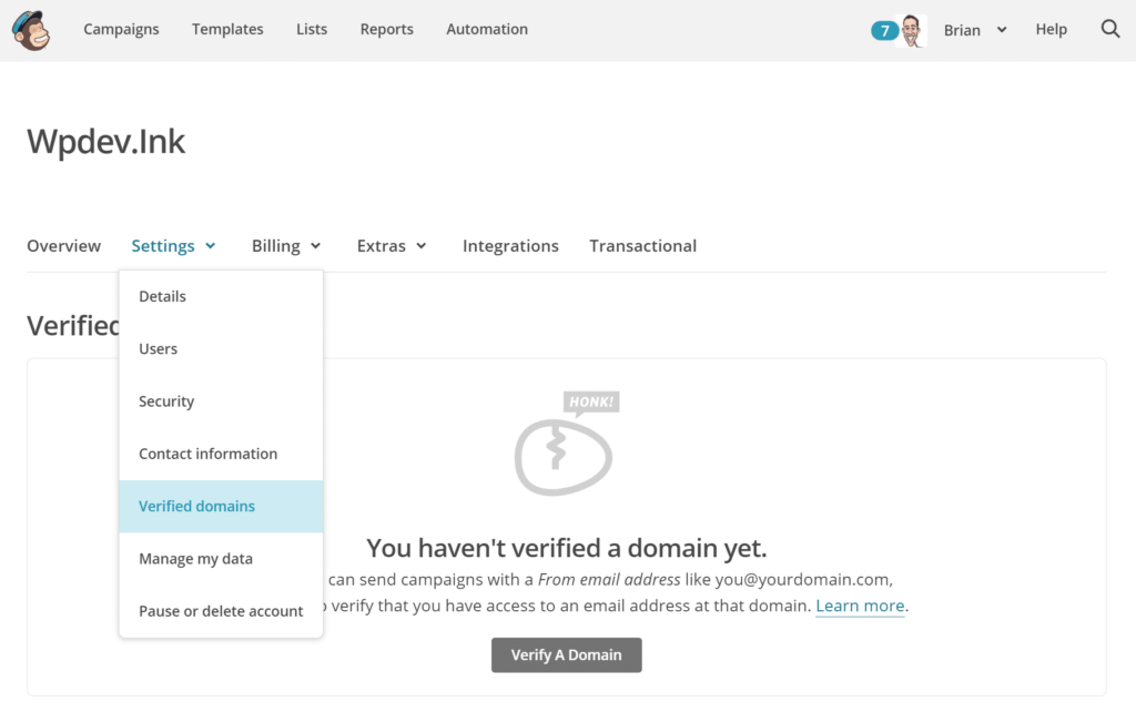 单击“Settings”,然后单击“Verified domains”。如果您从未设置过,您将需要单击“Verify a domain”。否则,您将看到当前已验证域的列表和绿色/红色指示器,以显示它们当前是否已验证。