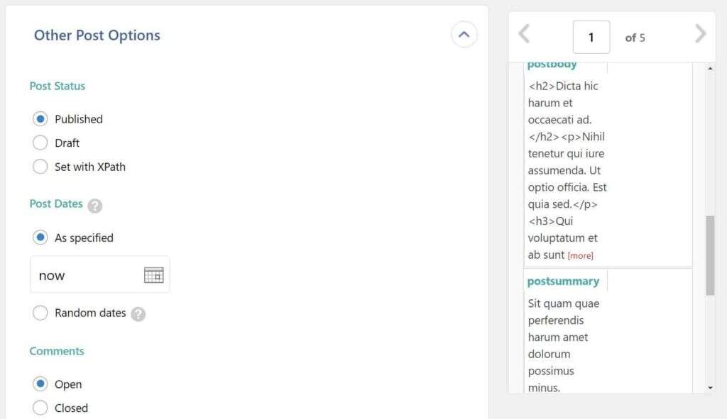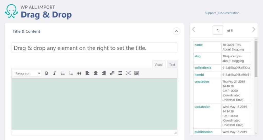 例如,您需要将文章的name(从右侧)拖到标题字段并将文章postbody拖到相关区域。您还将看到用于添加分类法(例如类别和标签)以及配置其他设置(例如文章状态)的选项: