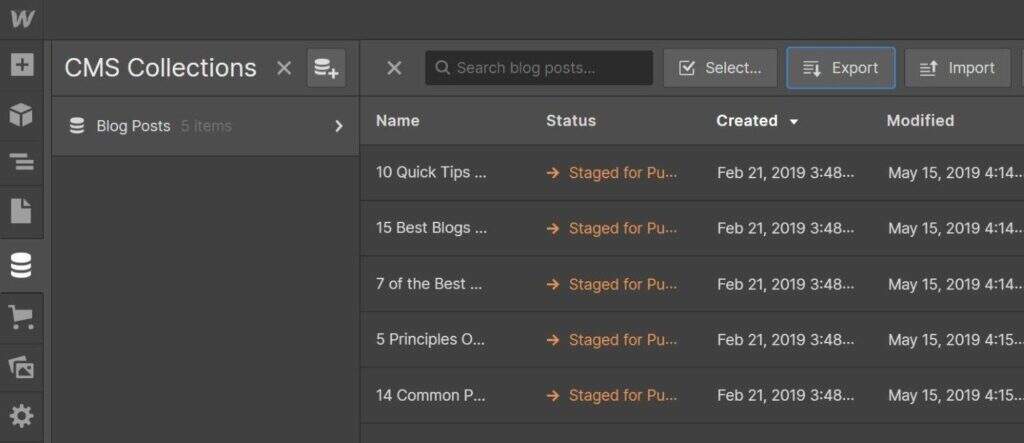 要导出您的内容,请转到您的Webflow设计器并单击CMS Collections面板。在这里,您可以看到Webflow服务器上的所有文件和数据:
