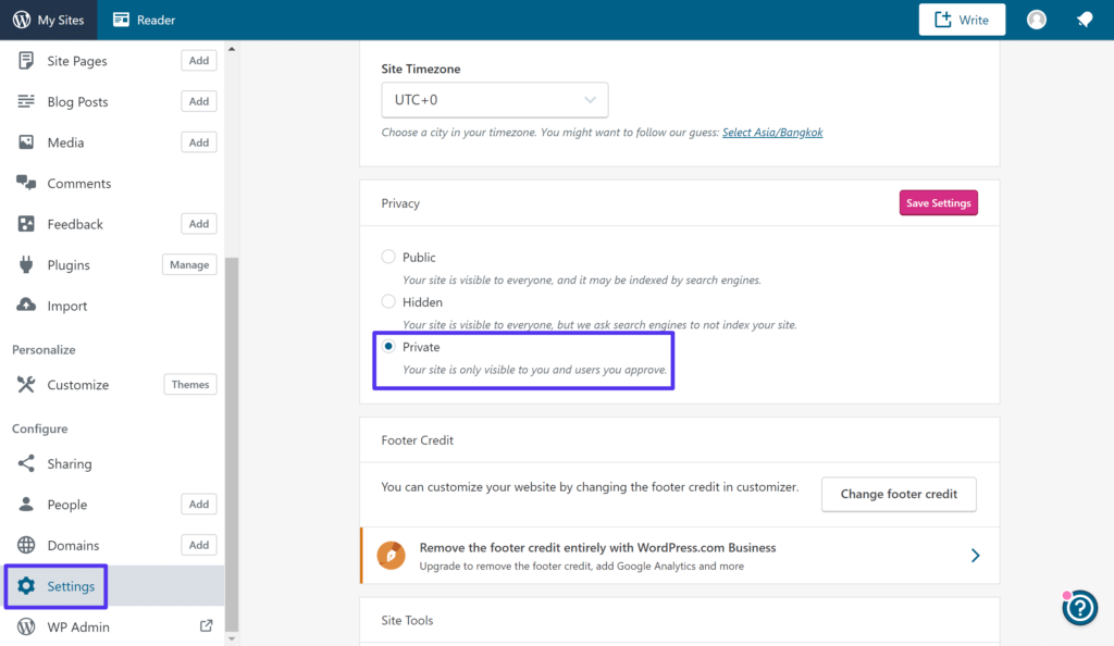 为此,请转到WordPress.com仪表盘中的设置区域,然后选择隐私设置下的私人选项: