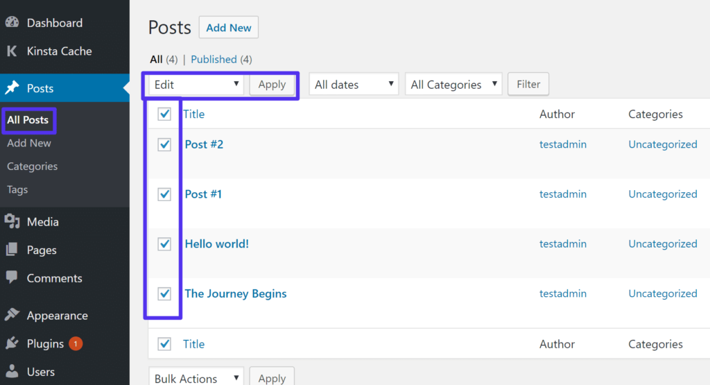 安装并激活插件后,转到WordPress仪表盘中的文章区域。使用复选框选择所有文章,然后从下拉列表中选择编辑。然后,单击应用: