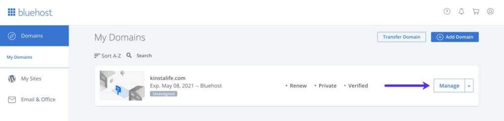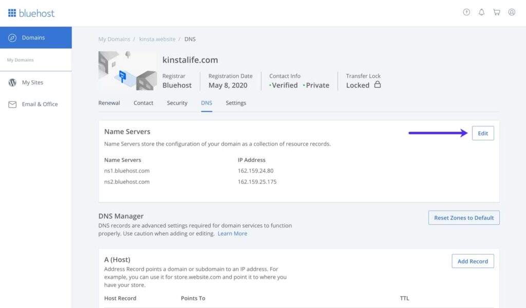 如果您的域在Bluehost注册,有两种方法可以将您的域指向网站服务器。第一种意见是在Bluehost管理DNS并添加指向您的服务器站点的A记录。
