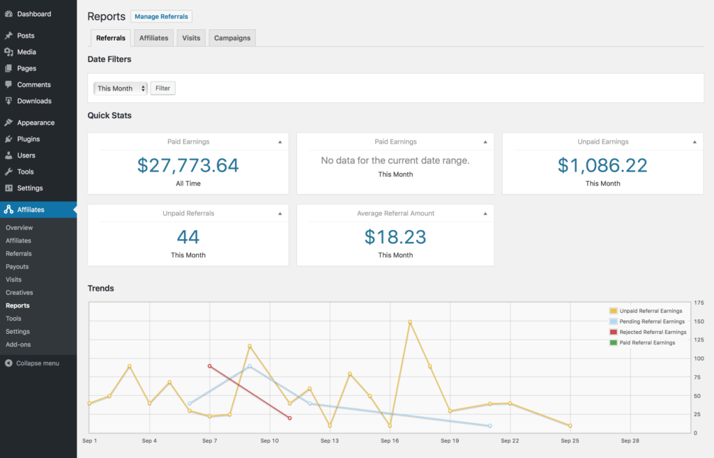 您可以使用AffiliateWP进一步扩展EDD ,这是由同一团队创建的高级产品。这很好地集成在一起,您甚至不会注意到它们是单独的产品。