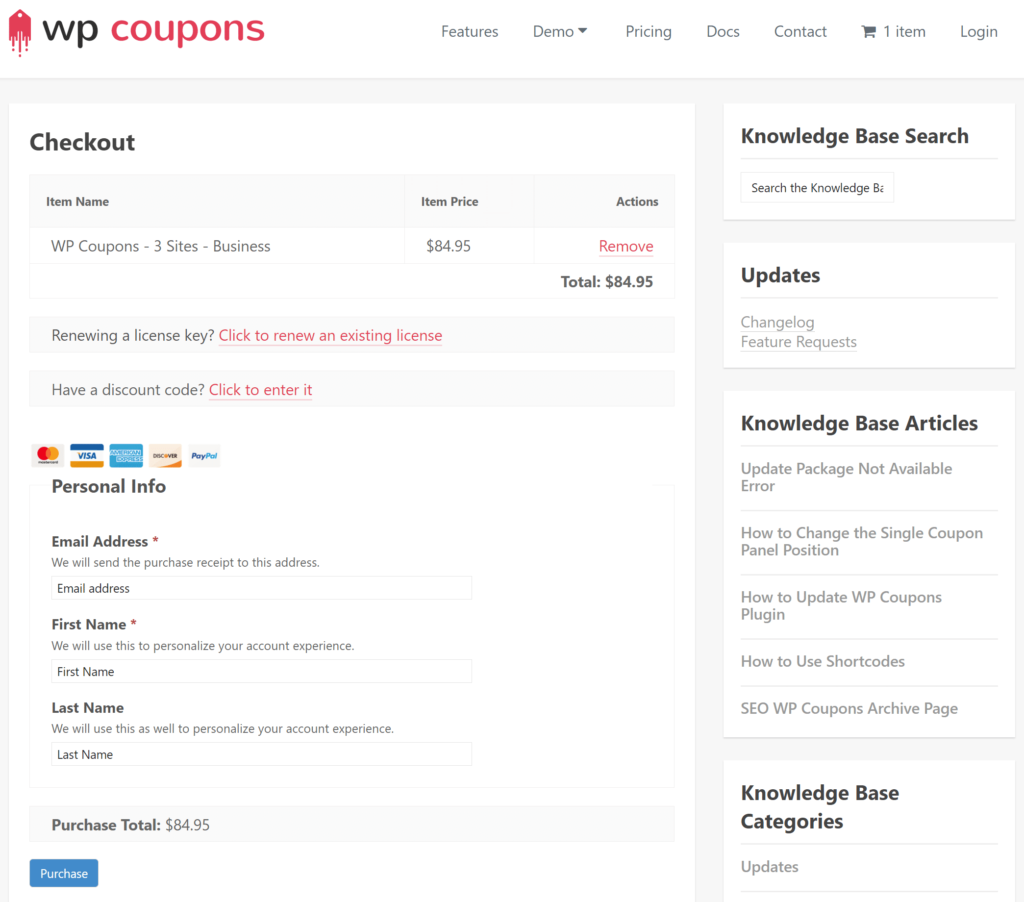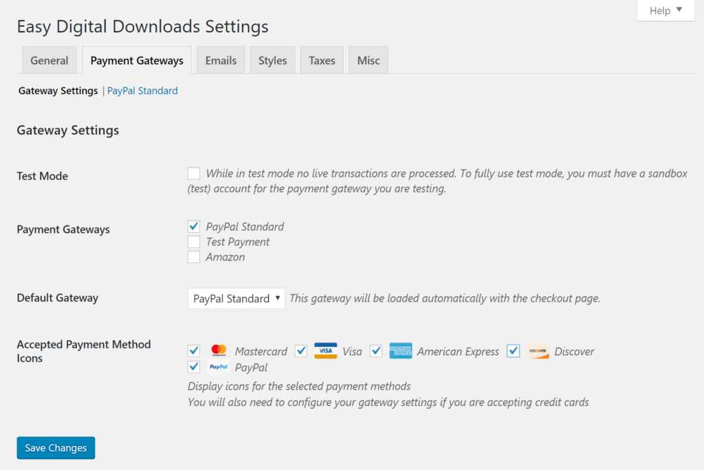 请记住,您还可以购买高级扩展以使用其他支付网关,例如 Stripe、Braintree、Dwolla、GoCardless 等。默认情况下,PayPal标准将通过他们的网站处理交易。这意味着您的客户将在您的网站上结账,发布到PayPal,然后被重定向回来。如果您希望他们留在您的网站上,您可以升级到PayPal Pro付款或使用其他提供商,例如Stripe。查看我们关于如何使用Easy Digital Downloads设置Stripe的深入教程或我们的比较:Stipe与PayPal。