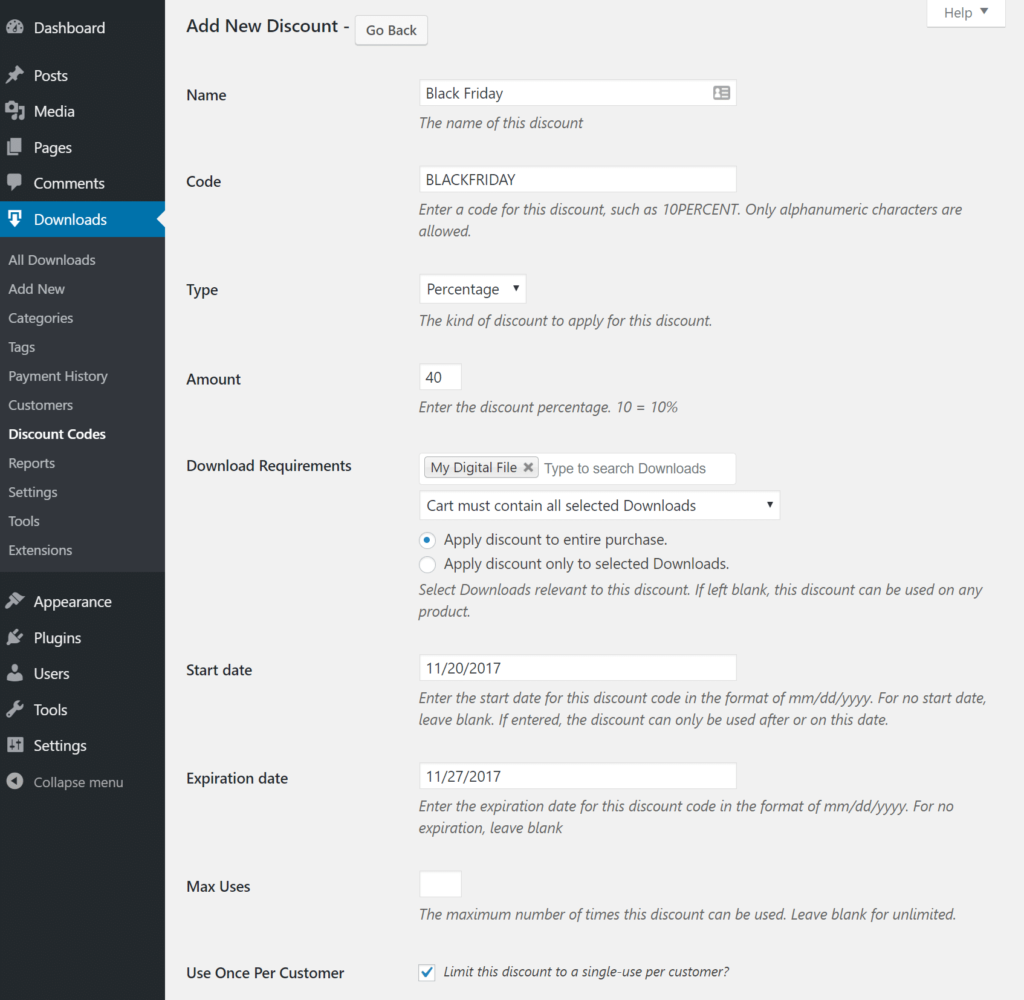 想要为黑色星期五创建折扣代码?没问题。只需单击“Downloads”下的“Discount Codes”,然后根据需要创建任意数量的优惠券和折扣代码。您可以选择产品的百分比折扣或统一费率金额。您可以设置到期日期,甚至可以限制每位客户使用一次。使用EDD时不时地进行销售以提升您的产品非常容易。