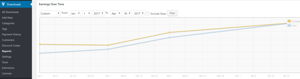 并且不要忘记查看报告数据和付款历史数据。一件好事也是PayPal也与EDD对话。因此,如果您销售产品并且他们通过PayPal付款,它将在EDD中标记为已付款。或者,如果您稍后对产品进行退款,它会自动更新EDD以显示已退款,并更新您当月的总收入。