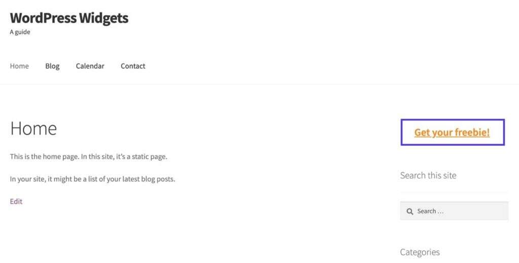 现在,如果您查看您的站点,您会发现您添加到小工具区域的任何小工具都会显示在正确的位置。如果它们不在正确的位置,请返回并编辑您的模板文件,确保代码位于您想要的位置。您可能还需要编辑您的CSS以获得您想要的方式。
