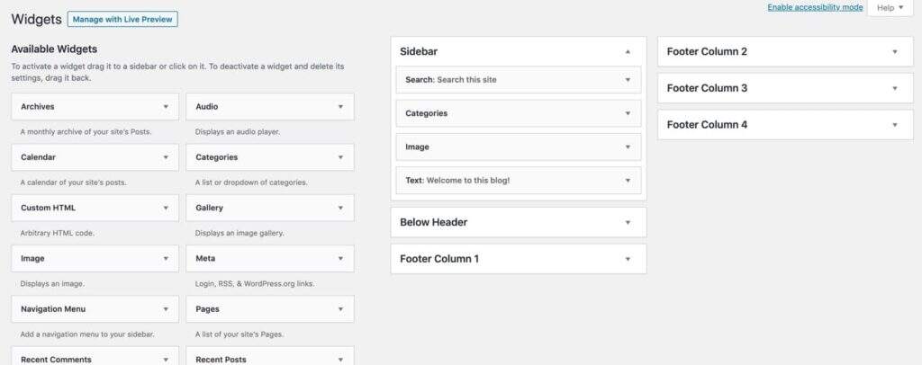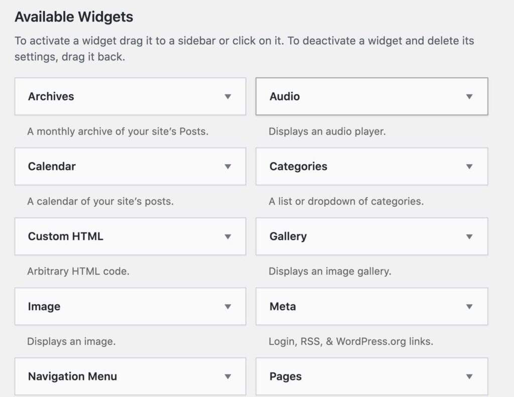要将小工具添加到您的站点,您需要将其添加到小工具区域。小工具区域是由您的主题创建的,因为它们与您网站的设计和布局有关,而不是与功能有关。