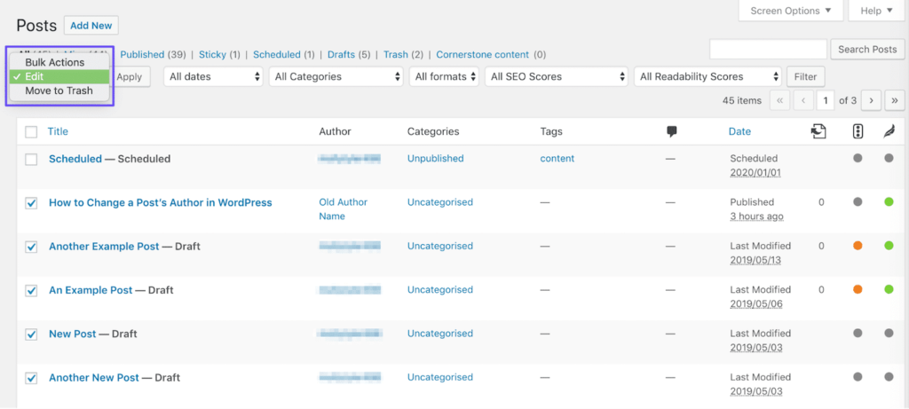 虽然您可以为您之前的贡献者留下的每个文章更改作者,但使用WordPress的批量编辑功能更有效。这样,您可以通过单击按钮更改所有相关文章的名称。