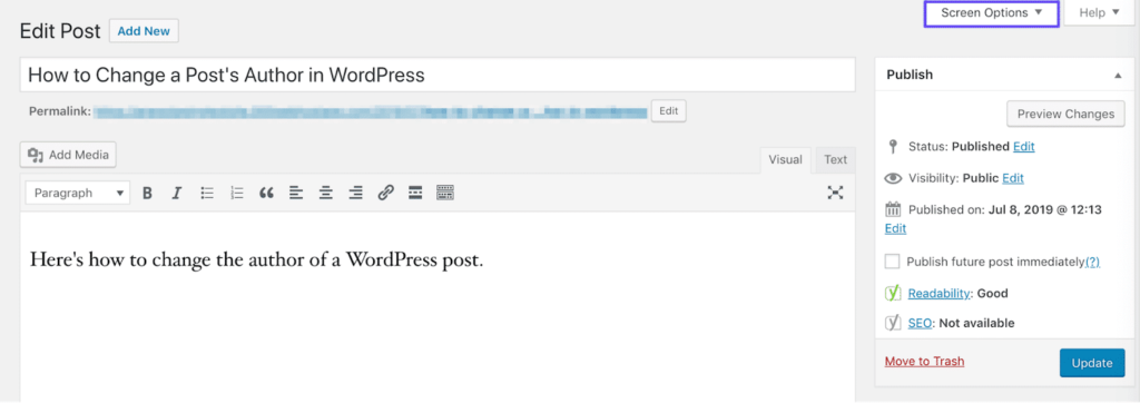 无论您使用哪个编辑器,您都可以使用文章列表中的快速编辑功能更改文章的作者。只需选择文章标题下的快速编辑选项,然后从相关下拉菜单中选择新作者,然后单击更新按钮: