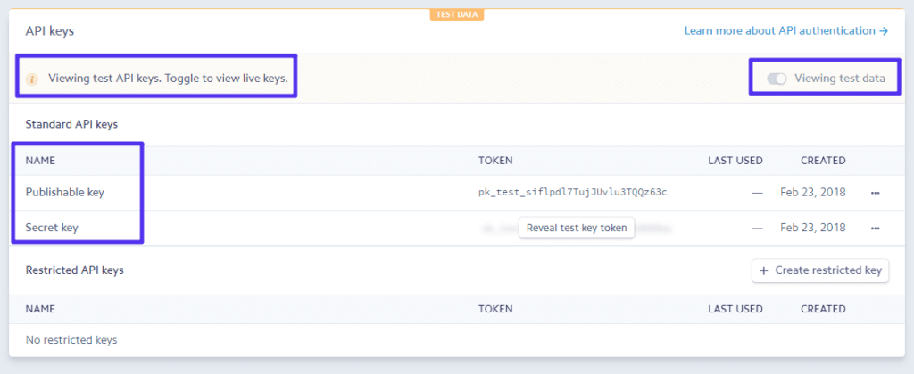 - 实时API密钥适用于您真正想要开始接受真实付款的情况。