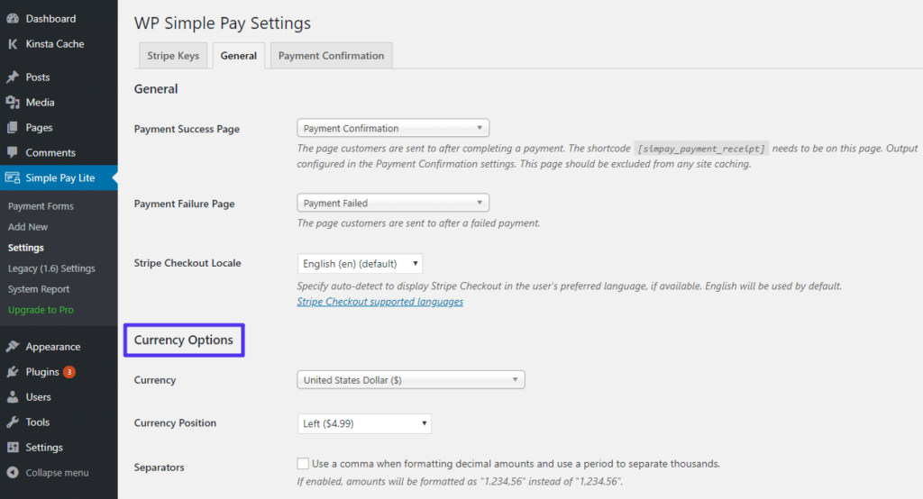 默认情况下,WP Simple Pay使用美元作为捐赠按钮的货币。如果您想使用不同的货币,您可以通过转到“General”设置选项卡来更改它: