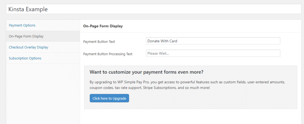 例如,在On-Page Form Display区域中,您可以更改文本,使按钮显示为“Donate With Card”而不是“Pay With Card”: